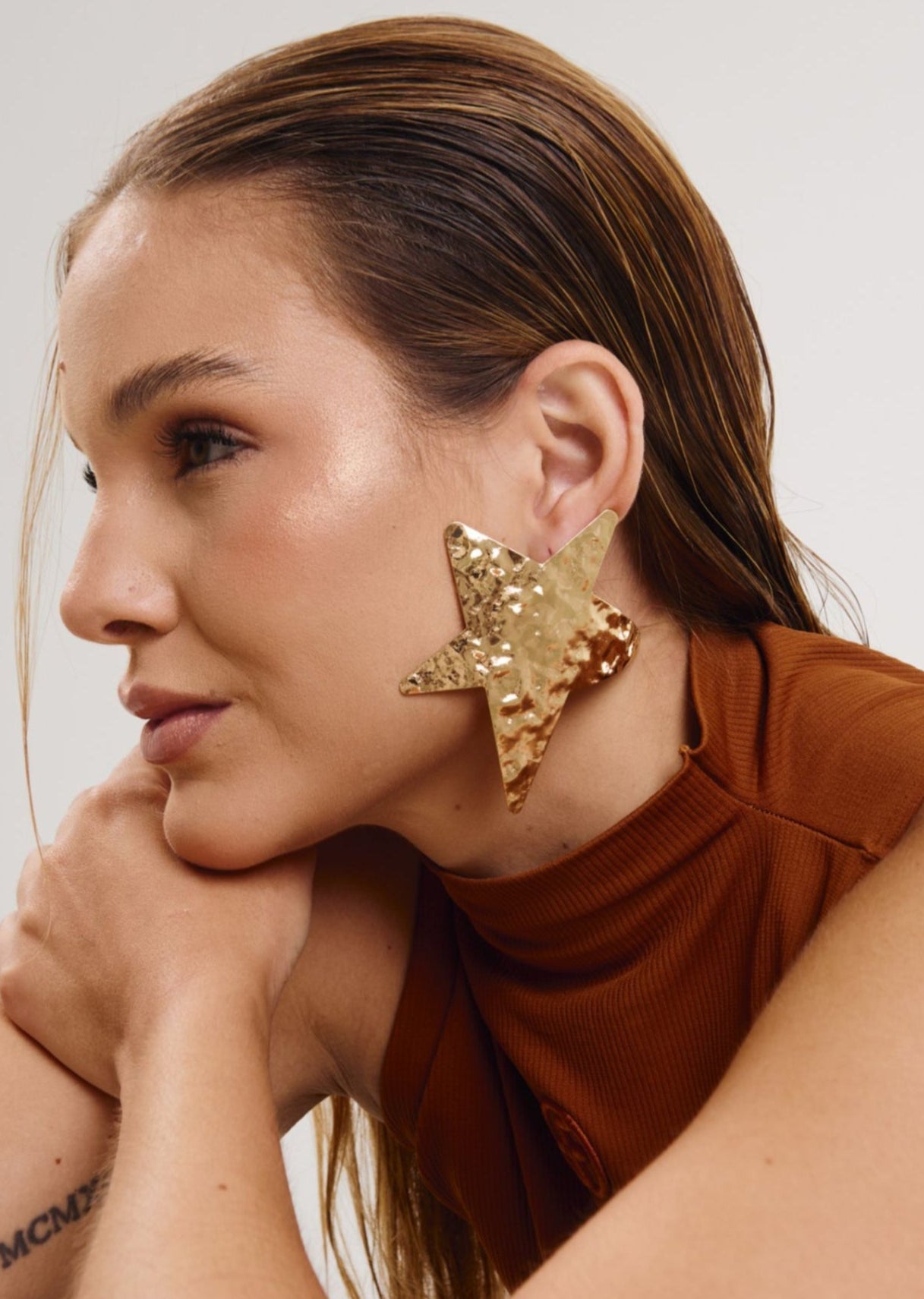 Este brinco de pino em formato de estrela é uma peça marcante e cheia de personalidade. Com um acabamento dourado e uma textura irregular, que simula um efeito de metal amassado, o acessório ganha um visual moderno e artístico. A superfície texturizada cria um brilho único, refletindo a luz de forma vibrante e garantindo que o brinco se destaque. É a escolha perfeita para quem quer um toque de glamour ousado.