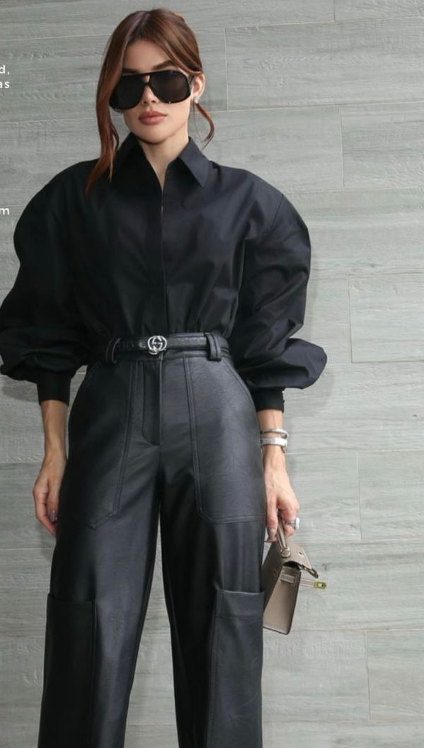 A camisa apresenta um corte oversized e ligeiramente estruturado que confere imponência. O destaque principal são as mangas longas com volume (bufantes), que se reúnem em punhos mais ajustados, criando uma silhueta poderosa e fashion-forward. A gola clássica e o fechamento em botões a tornam versátil para o dia ou para a noite.