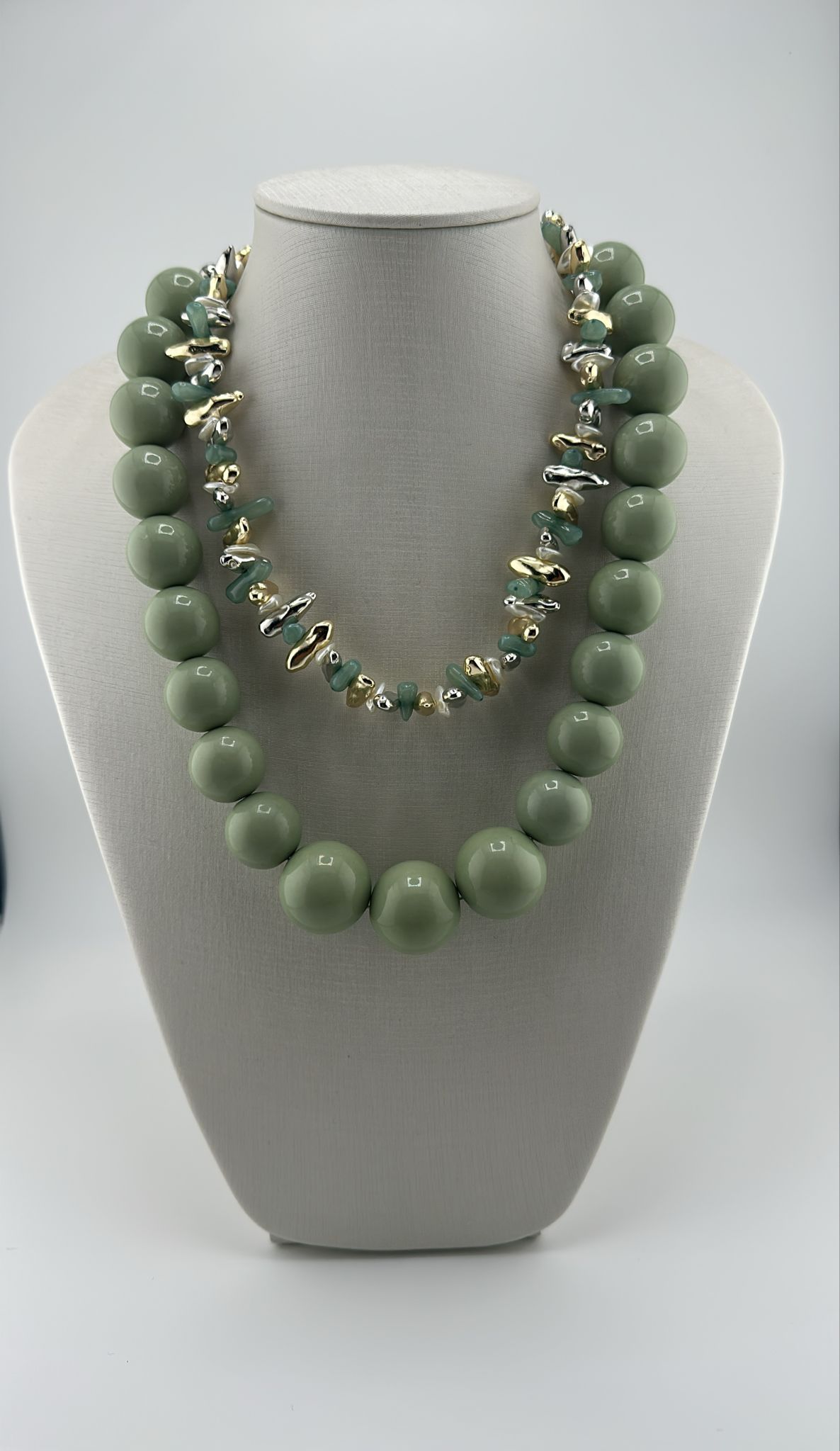 Este colar de duas voltas apresenta um design elegante e de destaque. A volta interna é uma mistura de pequenas pedras polidas em tons de verde-claro e pedras irregulares douradas e prateadas, criando um contraste de cores e texturas. A volta externa, que é mais longa, é feita com grandes contas esféricas em um tom de verde-claro opaco e suave. O colar é ideal para adicionar um toque de cor e sofisticação a qualquer look.