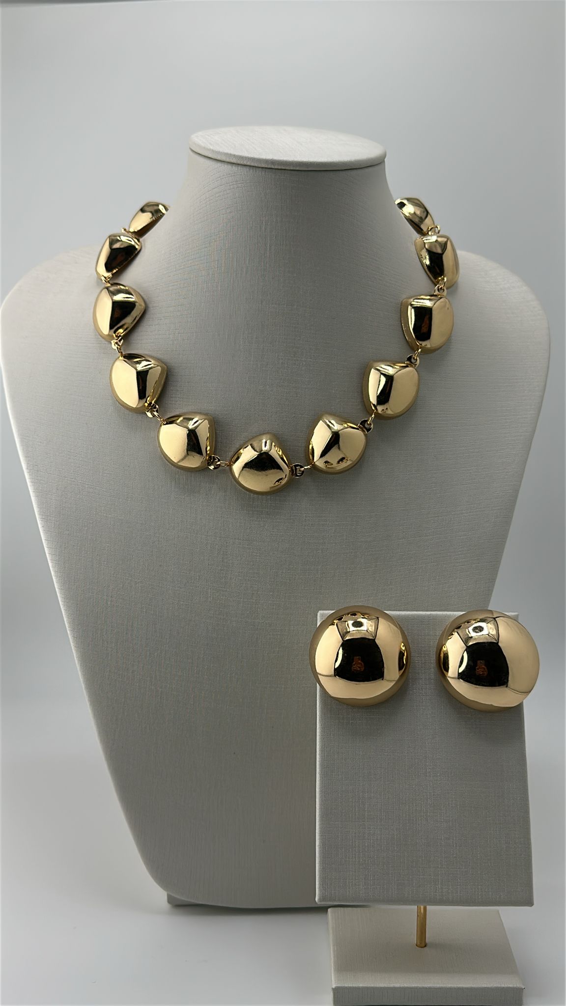 Brincos: Os brincos seguem a mesma estética do colar, com um design em forma de meia-esfera e um acabamento dourado polido e super brilhante. A sua forma arredondada e suave complementa perfeitamente o colar, adicionando sofisticação ao conjunto.